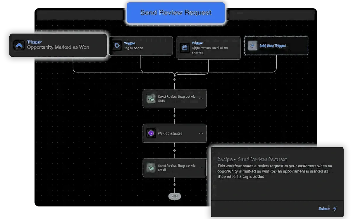 Send appointment reminders, get more Google reviews & more. automatically. Our workflow builder eliminates tedious manual tasks